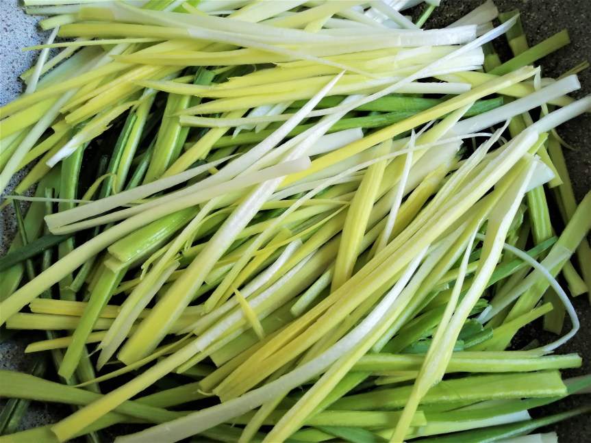 - Pulire bene le verdure. Tagliare il porro e gli asparagi a fettine sottili e lunghe come spaghetti (vedi foto)