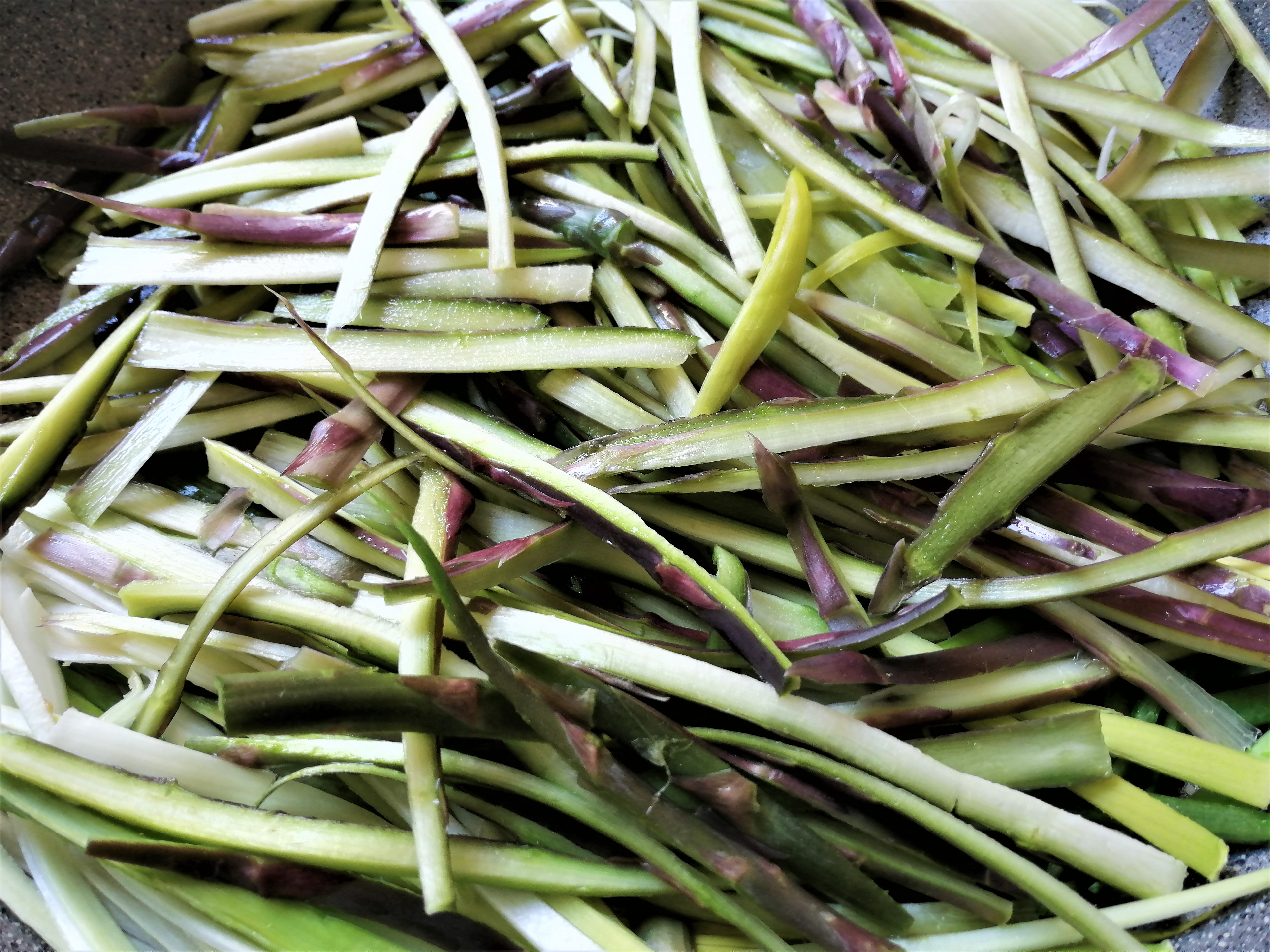 - Pulire bene le verdure. Tagliare il porro e gli asparagi a fettine sottili e lunghe come spaghetti (vedi foto)