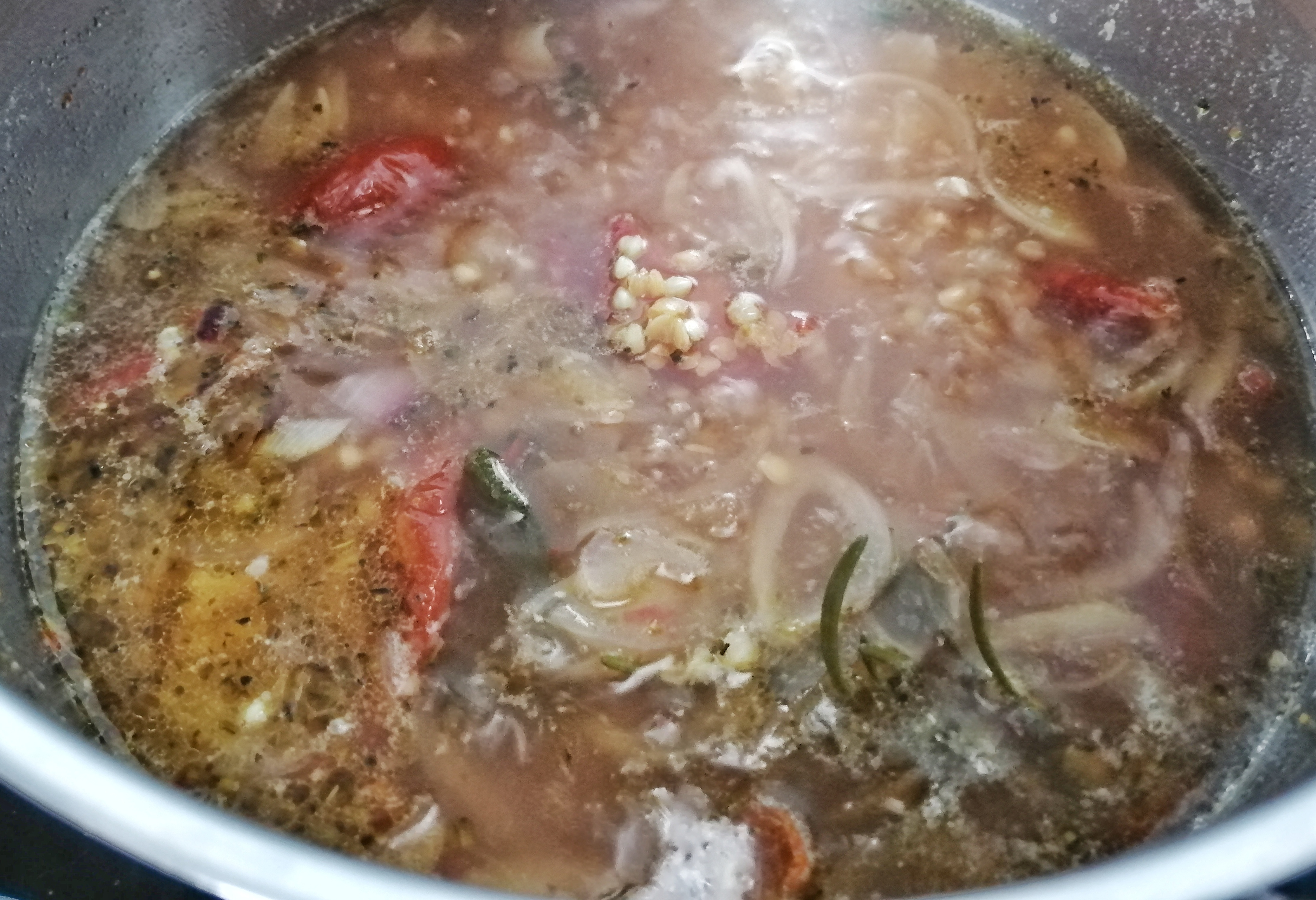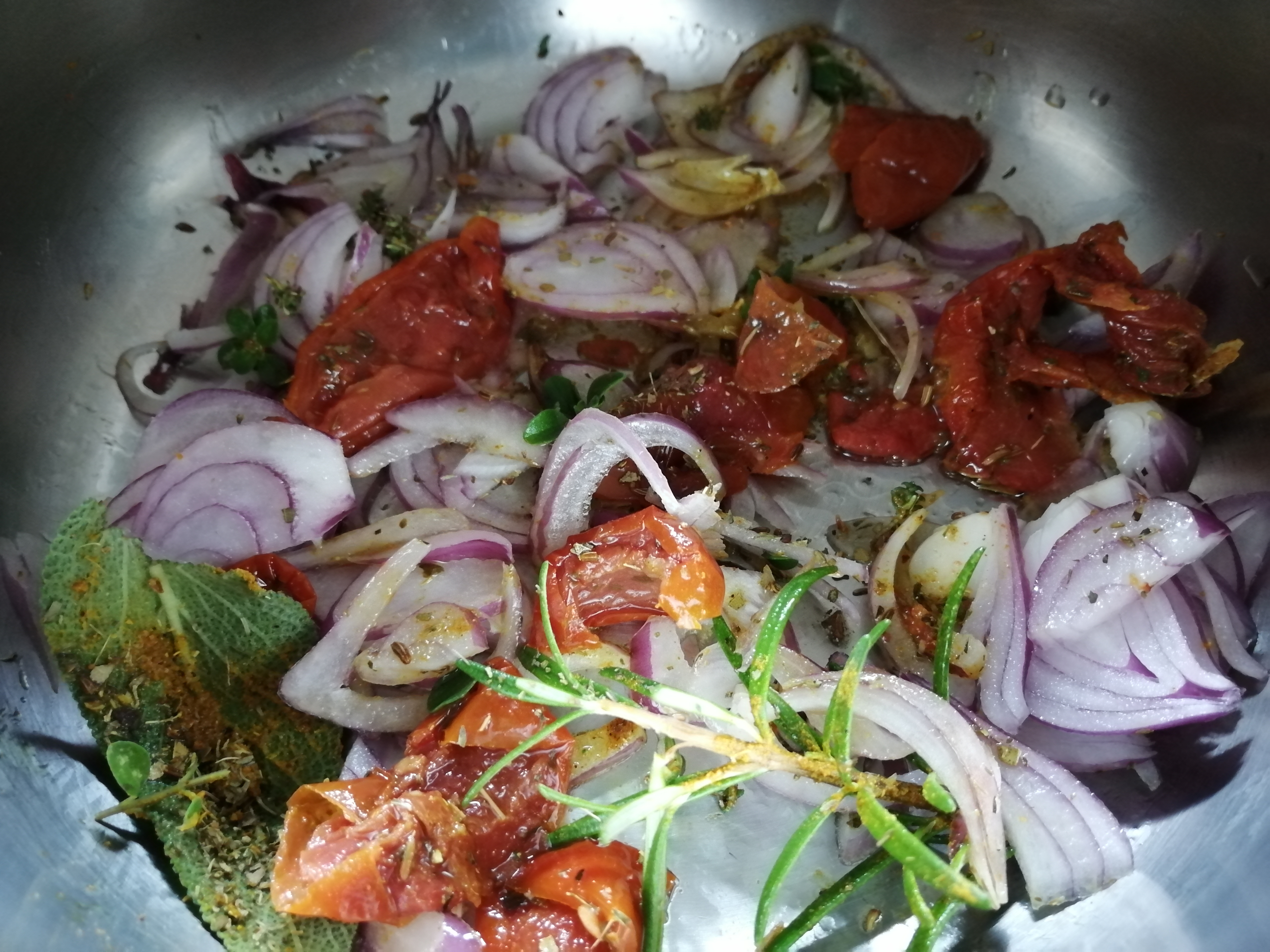 - Aggiungere i pomodorini secchi, le erbe aromatiche, il curry e la salsa di soia con un po’ di acqua e lasciare insaporire il brodo per almeno 5-8 minuti (vedi foto)