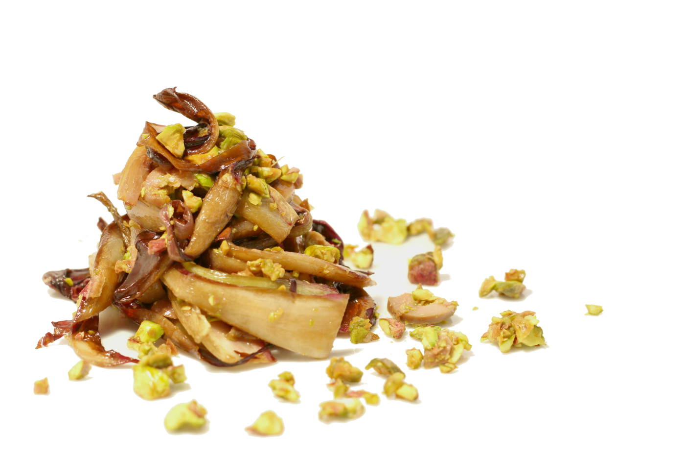 Oggi proviamo con il radicchio tardivo: le foglie affusolate si prestano molto bene a diventare spaghetti, per cui le tagliamo circa a metà e le saltiamo in padella. Qualche oliva e dei pistacchi ed ecco un contorno veloce e sfizioso!